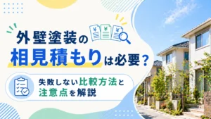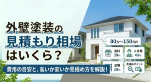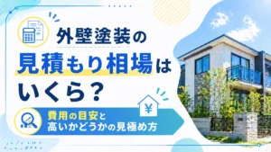 外壁塗装の見積もりを取ったときに、「この金額って高いの?それとも相場通り?」と迷ったことはありませんか。外壁塗装は多額な費用がかかることもあり、適正な価格かどうかを判断するのは難しい工事のひとつです。 この記事では、外壁塗装の見積もり相場の目安や内訳、相場より高くなる・安くなる理由、適正価格の判断方法までわかりやすく解説します。見積もりで失敗したくない方は、ぜひ参考にしてください。 外壁塗装の見積もり相場はいくら?【結論】 外壁塗装の見積もり相場は、住宅の大きさによっておおよその目安があります。一般的な戸建て住宅の場合、以下がひとつの基準になります。 ただし、これらはあくまで目安であり、使用する塗料の種類や外壁の劣化状況、施工内容によって費用は大きく変動します。実際の金額は見積もりで確認することが重要です。 外壁塗装の見積もり相場【坪数別の目安】 ここでは、坪数ごとの外壁塗装の見積もり相場について、もう少し詳しく解説します。ご自身の住宅に近い条件と照らし合わせながら、目安として参考にしてください。 30坪の相場 30坪程度の住宅では、外壁塗装の費用は約80〜120万円が目安です。比較的コンパクトな住宅のため、足場費用や施工面積も抑えられ、全体的に費用は低めになる傾向があります。ただし、劣化が進んでいる場合や高性能な塗料を使用する場合は、上限に近い金額になることもあります。 40坪の相場 40坪前後の住宅では、約100〜140万円が相場となります。一般的な戸建て住宅の平均的なサイズであり、外壁面積も増えるため、30坪に比べて費用はやや高くなります。塗料の種類や付帯部分(雨樋や軒天など)の塗装範囲によっても価格差が出やすいポイントです。 50坪の相場 50坪程度の住宅になると、外壁塗装の費用は約120万〜160万円が目安です。建物が大きくなる分、足場や塗料の使用量、人件費も増えるため、全体的に費用が高くなります。また、外壁の形状が複雑な場合や補修箇所が多い場合は、さらに費用が上乗せされることもあります。 なお、外壁塗装の費用は塗料のグレードや建物の劣化状況によって大きく変わるため、あくまで参考価格として捉えることが大切です。塗り替えのタイミングについては、以下の記事もあわせてご確認ください。 外壁塗装の費用をチェック! あなたの家の場合、いくらくらい?無料かんたん見積もりチェック 外壁塗装の見積もりの内訳相場 外壁塗装の費用は「一式」でまとめて表示されることも多いですが、実際には複数の項目で構成されています。内訳を理解しておくことで、見積もりの妥当性を判断しやすくなります。 足場費用 足場費用は全体の約15〜25%程度を占めることが多く、相場としては15〜25万円前後が目安です。安全かつ効率的に作業を行うために必要不可欠な工程であり、削ることはできない費用です。 塗料費 塗料費は全体の約20〜30%程度を占めます。使用する塗料の種類(シリコン・フッ素・無機など)によって大きく変動し、耐用年数が長い塗料ほど費用は高くなります。 人件費 人件費は全体の約30%前後が目安です。塗装作業は職人の手作業が中心となるため、施工日数や作業人数によって費用が変わります。安すぎる場合は、作業工程の省略や人員不足の可能性もあるため注意が必要です。 下地処理費 下地処理は、塗装前にひび割れ補修や高圧洗浄などを行う工程で、仕上がりや耐久性に大きく影響します。費用としては全体の10〜20%程度が目安ですが、劣化状況によって大きく変動します。 なお、見積もりの中で「外壁塗装一式」といった表記が多い場合は注意が必要です。内訳が不明確だと、どの工程にどれだけ費用がかかっているのか判断できず、比較もしにくくなります。できるだけ項目ごとに分かれている見積もりを確認することが大切です。 外壁塗装の見積もりが相場より高くなる4つの理由 見積もり金額が相場より高い場合でも、必ずしも不適切とは限りません。工事内容や条件によっては、適正な範囲内で高くなるケースもあります。ここでは主な理由を解説します。 塗料のグレードが高い 耐久性の高いフッ素塗料や無機塗料などを使用する場合、費用は相場より高くなる傾向があります。その分、メンテナンス周期が長くなるため、長期的にはコストパフォーマンスが良くなるケースもあります。 劣化が進んでいる 外壁のひび割れや剥がれが進行している場合、補修や下地処理に追加費用がかかります。見積もりが高くなる原因のひとつですが、必要な処置であることが多いため、内容をしっかり確認することが重要です。 付帯工事が含まれている 雨樋・軒天・破風板などの付帯部分の塗装や補修が含まれている場合、費用は上がります。一見高く見えても、建物全体のメンテナンスとしては適切な提案であることもあります。 業者の利益設定 業者によって利益の設定や価格方針が異なるため、同じ工事内容でも見積もり金額に差が出ることがあ