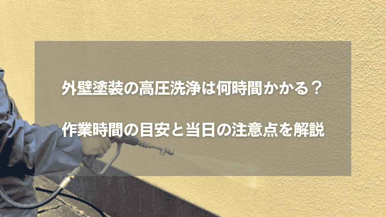外壁塗装の中でも、初日に行われる「高圧洗浄」はとても重要な工程です。しかし、実際には「何時間くらいかかるの?」「その間、家でどう過ごせばいいの?」と疑問を持つ方が多い工程でもあります。 高圧洗浄の時間は、家の大きさや付帯部の洗浄範囲によって時間は前後します。そのため、事前に目安を知っておくことが大切です。 この記事では、高圧洗浄にかかる時間の目安、乾燥に必要な期間、当日気をつけたいポイントまで詳しく解説します。工事前の不安をしっかり解消して、スムーズに外壁塗装を進めましょう。 外壁塗装の高圧洗浄が必要な3つの理由 外壁塗装の工程の中でも、高圧洗浄は「仕上がり」と「耐久性」を左右する非常に重要なステップです。見た目を整えるだけでなく、塗料を長持ちさせるためにも欠かせません。ここでは、高圧洗浄が必要な根拠を3つに分けて解説します。 汚れ・カビ・苔を落として塗料の密着を高めるため 外壁には、時間とともにチョーキング(旧塗膜の粉化)や排気ガス汚れ、カビや苔が付着します。これらが残ったまま塗装すると、塗料がしっかり密着せず、数年で浮きや剥がれが起きやすくなります。 高圧洗浄で汚れを丁寧に除去することで、塗料が外壁にしっかり食いつき、仕上がりと耐久性が大きく向上します。 古い塗膜や剥がれを取り除いて剥離を防ぐため 外壁に古い塗膜の剥がれや浮きがあると、新しい塗料を塗ってもその部分から再び剥がれてしまいます。汚れが残ったまま塗装すると、塗料が密着しないため施工後わずか数年での剥離につながることもあります。 高圧洗浄は、古い塗膜や弱った部分を除去するための重要工程で、「長持ちする塗装」に欠かせない作業です。 美観を整え、ムラのない塗装をするため 外壁にゴミや汚れが残ったまま塗装すると、仕上がりの見た目にムラや凹凸が発生する原因になります。特に色の濃い塗料では、汚れの影響が仕上がりに現れやすいです。 高圧洗浄で表面を均一に整えることで、塗料のノリが良くなり、ムラのない美しい仕上がりが実現します。まさに「良い塗装は良い洗浄から」と言われるほど重要な工程です。 外壁塗装の高圧洗浄はどれくらい時間がかかる? 高圧洗浄は外壁塗装の初日に行われる作業で、家全体の汚れを落とす重要な工程です。作業時間は家の大きさや洗浄範囲によって変わりますが、一般的な戸建てであれば数時間で完了します。 一般的な戸建ては「2〜4時間」が目安 30〜40坪ほどの住宅なら、外壁のみの洗浄で2〜4時間程度が一般的な作業時間です。汚れが少なく作業しやすい環境であれば、さらに短くなることもあります。 外壁+付帯部(雨戸・雨樋など)も洗う場合は3〜5時間 雨戸や雨樋、破風、軒天などの付帯部も一緒に洗浄する場合は作業範囲が広がるため、外壁のみより時間がかかります。その場合は、全体で3〜5時間ほどを見込んでおくと良いでしょう。 外壁塗装はミツモールへご相談を ミツモールでは、第三者の立場から優良施工会社だけを厳選し、ご希望に合った業者と最適な価格帯をご紹介する無料の見積もりサポートサービスを提供しています。 ご相談はこちら 外壁塗装の高圧洗浄後の乾燥時間の目安 高圧洗浄の後は、塗装を行う前に外壁をしっかり乾燥させる必要があります。この乾燥が不十分だと、塗料の密着が弱まり、早期の剥がれや膨れの原因になるため、非常に重要な工程です。 一般的には1〜2日乾燥が必要 通常の戸建て住宅であれば、高圧洗浄後の乾燥時間は1〜2日程度が目安です。表面が乾いたように見えても、内部に水分が残っていると塗膜不良につながるため、しっかり時間を確保します。 乾燥時間が変わる要因 実際の乾燥時間は、天候や季節によって大きく変わります。以下の条件が揃うと乾燥が遅れやすくなるため注意が必要です。 とくに冬場は気温が低く湿度が高いため、場合によっては2日以上乾燥させるケースもあります。業者と日程を調整し、十分な乾燥時間を確保することが大切です。 外壁塗装の高圧洗浄にかかる時間が変わる3つの要因 高圧洗浄の作業時間は「家の大きさ」だけで決まるわけではありません。外壁の状態や付帯部の有無など、さまざまな要因が時間に影響します。ここでは、洗浄時間が前後する主な3つのポイントを解説します。 家の大きさ(坪数・外壁の面積) 最も時間に影響するのが、家の大きさや外壁面積です。家が大きいほど洗浄すべき面が広くなり、当然ながら作業時間も長くなります。 屋根洗浄も同時に行う場合は、さらに時間が追加されることがあります。 汚れ・カビ・苔の量 外壁の汚れ具合も作業時間に大きく影響します。特に以下のようなケースでは時間がかかります。 汚れが多い場合は、洗浄機の圧を調整しながらじっくり洗うため、通常より時間を要します。 付帯部(雨戸・軒天・雨樋)の洗浄範囲 外壁以外の「付帯部」を洗浄するかどうかも、時間を左右する大きなポイントです。付帯部とは、