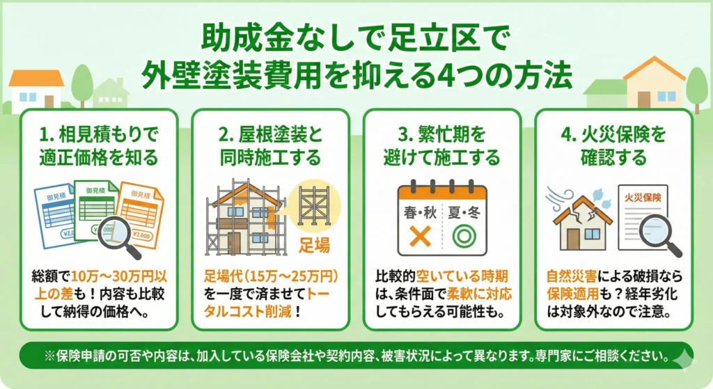 足立区では外壁塗装単体で使える助成金が限られているため、現実的な節約方法を知っておくことが重要です。ここでは、助成金に頼らなくても費用を抑えられる具体策を紹介します。