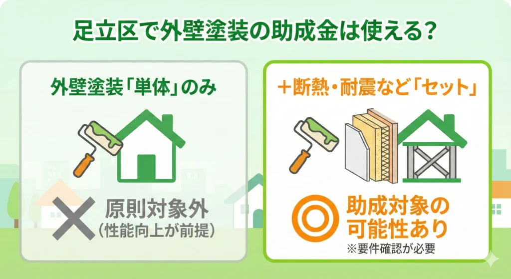 足立区では外壁塗装「単体」で使える助成金は原則ありません。多くの制度は、省エネ・耐震・バリアフリーなど性能向上を目的とした工事が前提です。そのため、外壁塗装だけでは対象外になるケースがほとんどです。