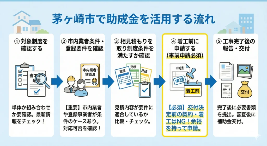 茅ヶ崎市で外壁塗装に関連する助成金を活用する場合、工事の進め方を間違えると対象外になることがあります。基本的な流れを押さえておきましょう。