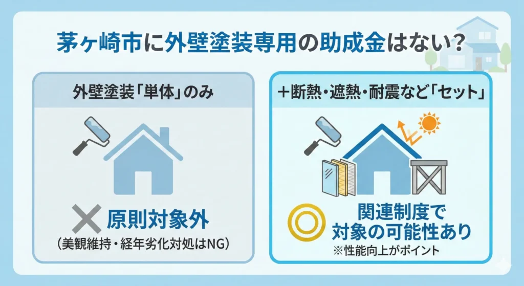 結論からお伝えすると、茅ヶ崎市には外壁塗装“単体”を対象とした専用の助成金制度は基本的にありません。外観の美観維持や経年劣化への対応のみを目的とした塗装工事は、原則として補助対象外となるケースが多いのが実情です。