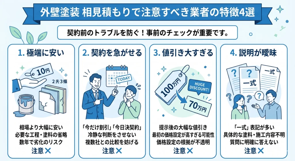 相見積もりを取る中で、注意すべき業者の特徴も見えてきます。契約後のトラブルを防ぐためにも、事前にチェックしておきましょう。