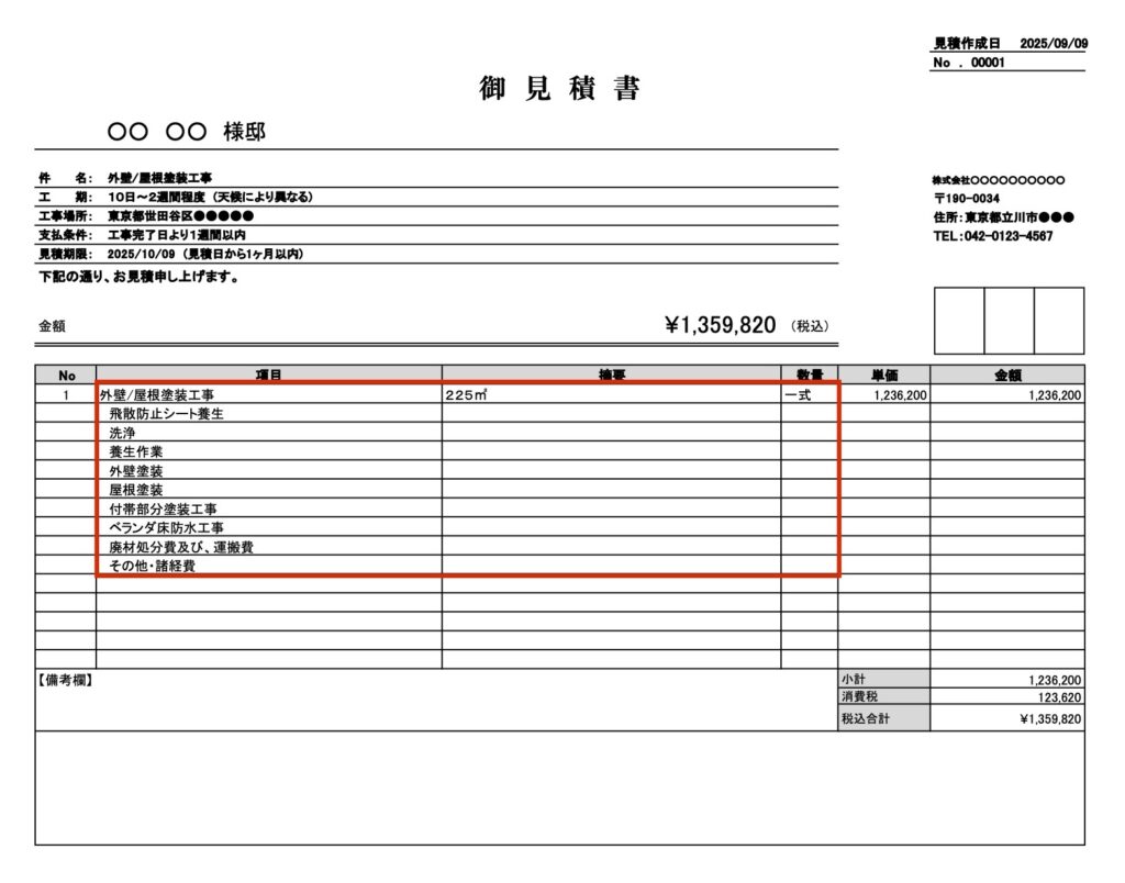 悪い見積書は、作業内容の詳細が書かれておらず「何にいくらかかっているのか」が判断できません。特に一式表記や塗料不明は注意が必要で、工事品質や価格の妥当性を見極めづらく、後悔につながるリスクがあります。