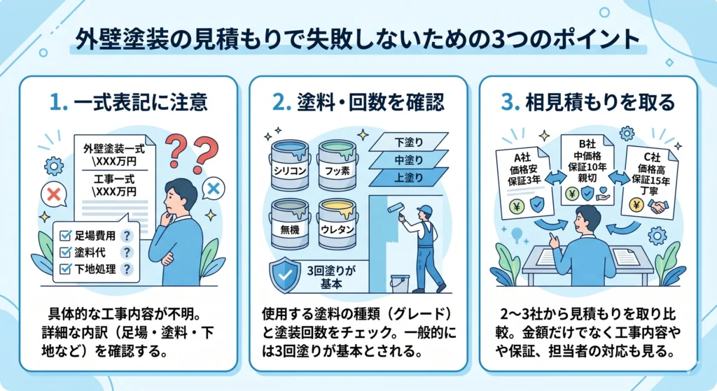 外壁塗装の見積もりでは、金額だけで判断すると失敗につながることがあります。相場を参考にしつつ、見積もりの中身まで確認することが大切です。ここでは、特に押さえておきたい3つのポイントを紹介します。