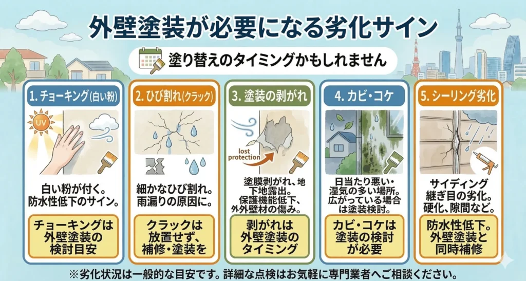 - チョーキングやひび割れなどの劣化サインを確認する