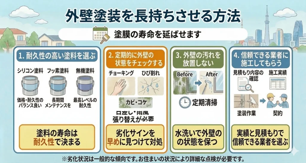 外壁塗装は決して安い工事ではないため、できるだけ長持ちさせたいと考える方も多いでしょう。日頃のメンテナンスや塗料の選び方によって、塗膜の寿命を延ばすことができます。