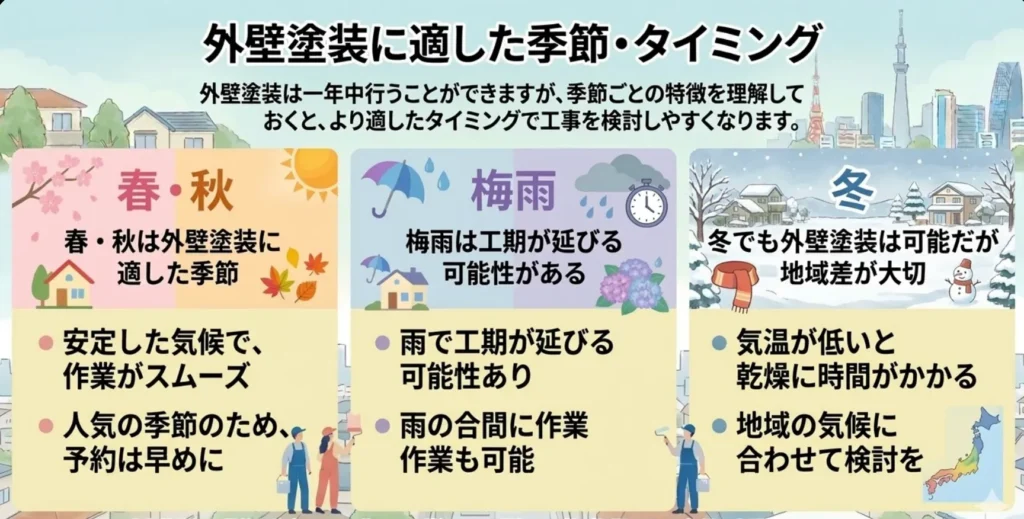 外壁塗装は一年中行うことができますが、気温や湿度、天候によって作業の進みやすさが変わります。季節ごとの特徴を理解しておくと、より適したタイミングで工事を検討しやすくなります。