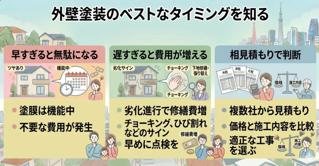 外壁塗装は、タイミングを悩む方が多い住宅メンテナンスのひとつです。外壁塗装のタイミングを間違えると、まだ必要のない時期に工事をしてしまったり、逆に劣化を放置して修繕費が高くなってしまうこともあります。