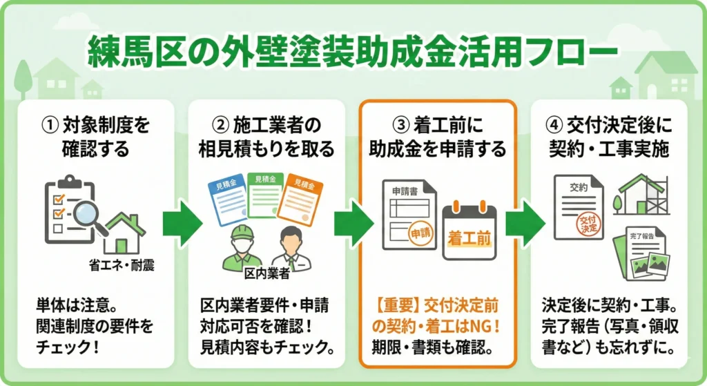練馬区で外壁塗装に関連する助成金を活用する場合は、一般的に次のような流れになります。特に「着工前の手続き」が重要なポイントです。
