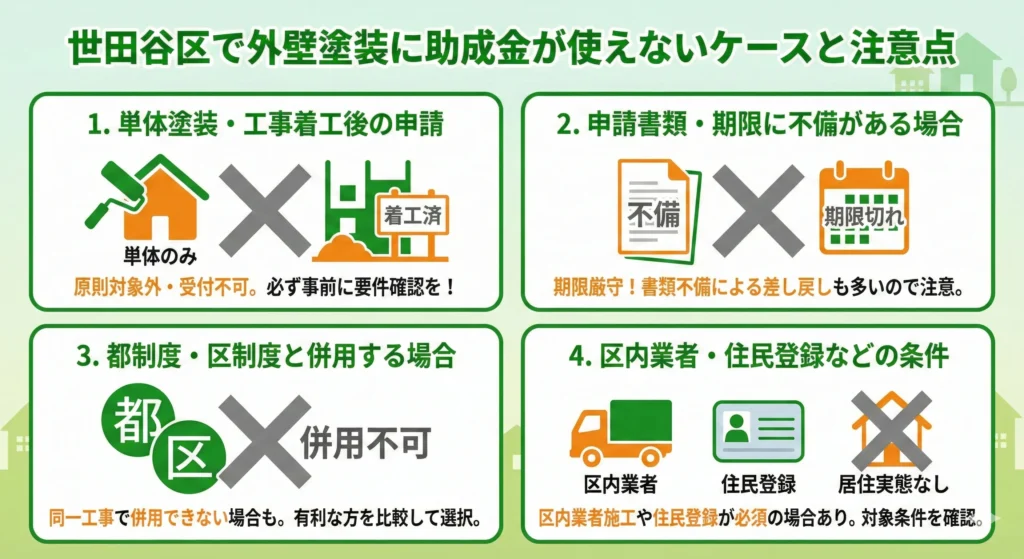 世田谷区で外壁塗装に関連する助成金を検討する際は、「使えないケース」をあらかじめ知っておくことが大切です。ここでは、特に見落としやすいポイントを整理します。