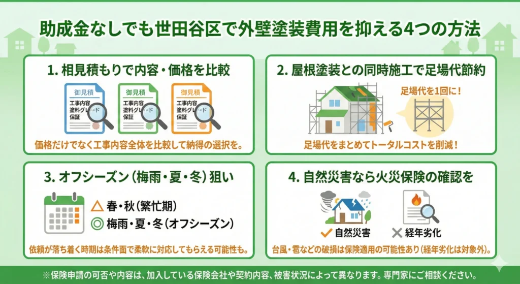 世田谷区では外壁塗装単体で助成金を使えるケースが限られるため、「助成金が使えない前提」で費用を抑える工夫もセットで考えるのが現実的です。